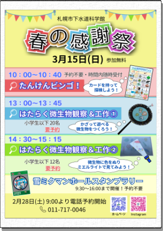 | イベント内容 | 日時:第2日曜日 11時00分~11時50分 ※イベント開催時は変更する場合があります。 内容:創成川水再生プラザの見学を通して、下水処理の仕組みを紹介します。 対象:小学生以上(歩きやすい靴でご参加ください) 定員:20名 参加方法:開始時刻までに科学館受付にお越しください。事前の申込は必要ありません。 下水道の仕組みについて楽しく学んでみませんか? ご希望の方は当日、受付までお越しください。 ![]() |