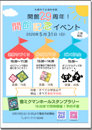 | イベント内容 | 日時:第2日曜日 11時00分~11時50分 ※イベント開催時は変更する場合があります。 内容:創成川水再生プラザの見学を通して、下水処理の仕組みを紹介します。 対象:小学生以上(歩きやすい靴でご参加ください) 定員:20名 参加方法:開始時刻までに科学館受付にお越しください。事前の申込は必要ありません。 下水道の仕組みについて楽しく学んでみませんか? ご希望の方は当日、受付までお越しください。 ![]() |